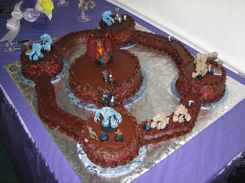 Red Dragon CakeYou can find more pictures of this beautiful monstrosity on FLICKR including it’s death and devourment. But this is not the only D&D themed cake made for, and in some cases by, rabid fans. Oh dear me, no. You might even say the best is yet to come!